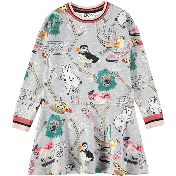 Платье Molo – это идеальный выбор для девочек! Изготовленное из 95% хлопка и 5% эластана, оно украшено очаровательными животными и цветами. Нежная серая основа с яркими животными, цветами и надписями создает игривое и в то же время уютное настроение. На фотографии видны аккуратные контрастные вставки по краю и мягкая текстура ткани. Качество от бренда из Украины и внимание к деталям делают эту одежду отличным выбором для вашего ребенка!