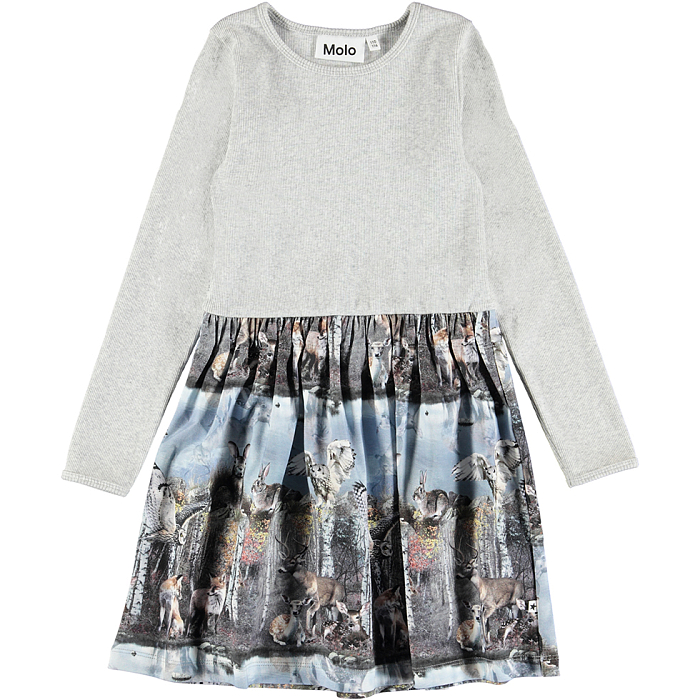 Платье Molo – это идеальный выбор для девочек! Изготовленное из 95% хлопка и 5% эластана, оно украшено очаровательным принтом с лесными животными: зайцами, лисами, оленями и другими дикими созданиями. Нежная текстура ткани и эластичный рукав делают это платье комфортным и стильным. На фотографии видна аккуратная эластичная окантовка по краю и мягкая текстура ткани. Качество от бренда из Украины и внимание к деталям делают эту модель отличным выбором для вашего малыша!