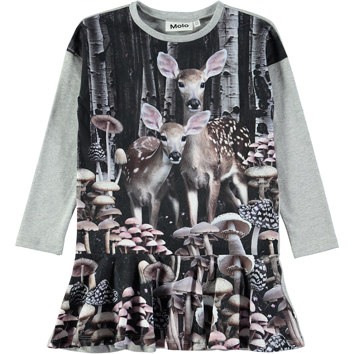 Платье Molo – это идеальный выбор для девочек! Изготовленное из 95% хлопка и 5% эластана, оно украшено очаровательными оленями и грибами в лесу. Нежная ткань с ярким принтом создает уютное и волшебное настроение. На фотографиях видны два олененка, стоящие рядом с грибами и деревьями. Качество от бренда из Украины и внимание к деталям делают эту модель отличным выбором для вашего ребенка!