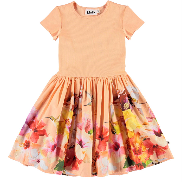Платье Molo – это идеальный выбор для девочек! Изготовленное из 100% хлопка с добавлением эластана, оно украшено ярким цветочным принтом с птицами на светло-розовом фоне. Нежная ткань с цветами и птицами создает легкую и веселую атмосферу. На фотографии видна аккуратная окантовка по краю и мягкое платье с эластичным поясом. Качество от бренда из Индии и внимание к деталям делают эту модель отличным выбором для вашего ребенка!
