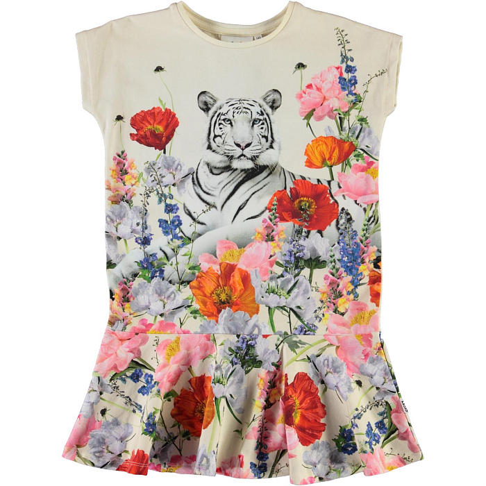 Платье Molo с изящным принтом тигра и цветов – идеальный выбор для маленькой модницы! Изготовлено из 95% органического хлопка и 5% эластана, что делает его мягким и эластичным. Принт с белым тигром и яркими цветами создает волшебное настроение, а рюш на юбке придает модели легкости и изысканности. Качество от бренда из Дании и внимание к деталям делают это платье отличным выбором для вашего ребенка!