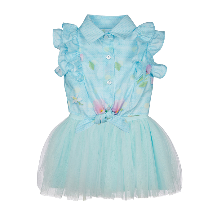 - 🎨 Дизайн: голубой цвет, цветочные принты, пышная юбка из тюля