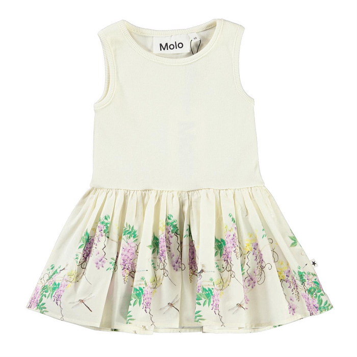 Платье Molo – это идеальный выбор для маленьких принцесс! Изготовленное из 100% органического хлопка, оно украшено очаровательным цветочным принтом с фиолетовыми цветами и зелеными листьями. Нежная белая основа с яркими цветами создает нежное и романтичное настроение. На фотографии видна аккуратная белая окантовка по краю и мягкая текстура ткани. Качество от бренда из Дании и внимание к деталям делают эту модель отличным выбором для вашего ребенка!