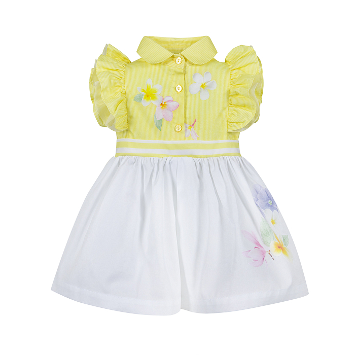 Платье Lapin House – это идеальный выбор для маленьких модниц! Изготовленное из 90% хлопка, 7% шелка и 3% лайкры, оно украшено очаровательными цветочными принтами. Яркие розовые, желтые и белые цветы на желтой полосатой ткани создают нежное и весеннее настроение. На фотографиях видны аккуратные воланы на рукавах и красивая белая подкладка. Качество от бренда из Греции и внимание к деталям делают эту модель отличным выбором для вашего ребенка!