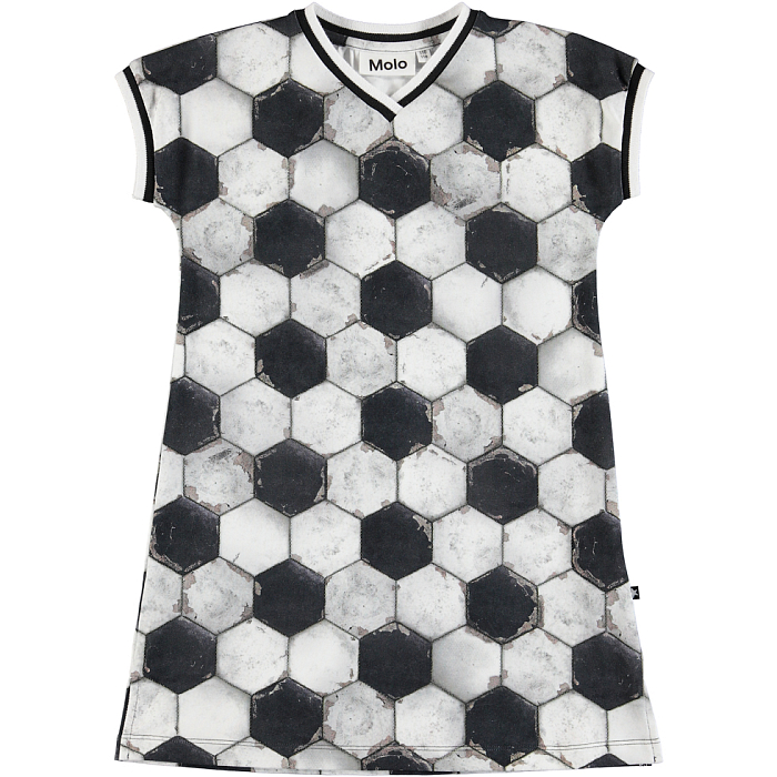 Платье тр. Molo – это стильный и комфортный выбор для девочек! Изготовленное из 95% хлопка и 5% эластана, оно украшено геометрическим принтом в черно-белые шестиугольники. Нежная ткань с эластичной окантовкой по краю обеспечивает идеальную посадку и комфорт. На фотографии видна аккуратная черная окантовка по краю и мягкая текстура ткани. Качество от бренда из Украины делает это платье отличным выбором для вашего ребенка!
