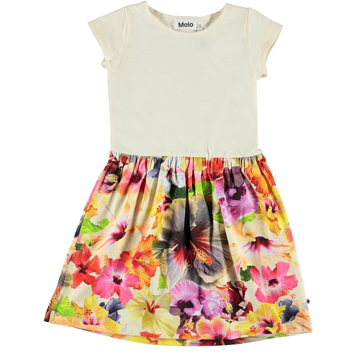 Платье для девочек Molo – это идеальный выбор для весеннего и летнего сезона! Изготовленное из 95% хлопка и 5% эластана, оно украшено ярким цветочным принтом с крупными розовыми, желтыми и фиолетовыми цветами на белом фоне. Прекрасная детская одежда от бренда из Индии, которая создаст неповторимый образ для вашего ребенка. На фотографиях видны аккуратные цветочные узоры и мягкая текстура ткани. Качество и внимание к деталям делают эту модель отличным выбором для вашего девочки!