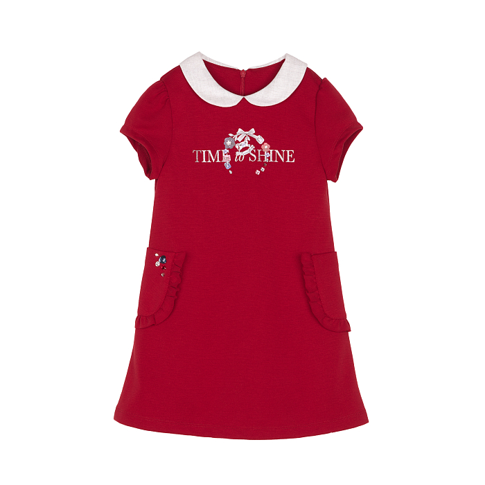 - 🎨 Дизайн: красный цвет, белый воротничок, карманы с оборками, вышивка Time to Shine