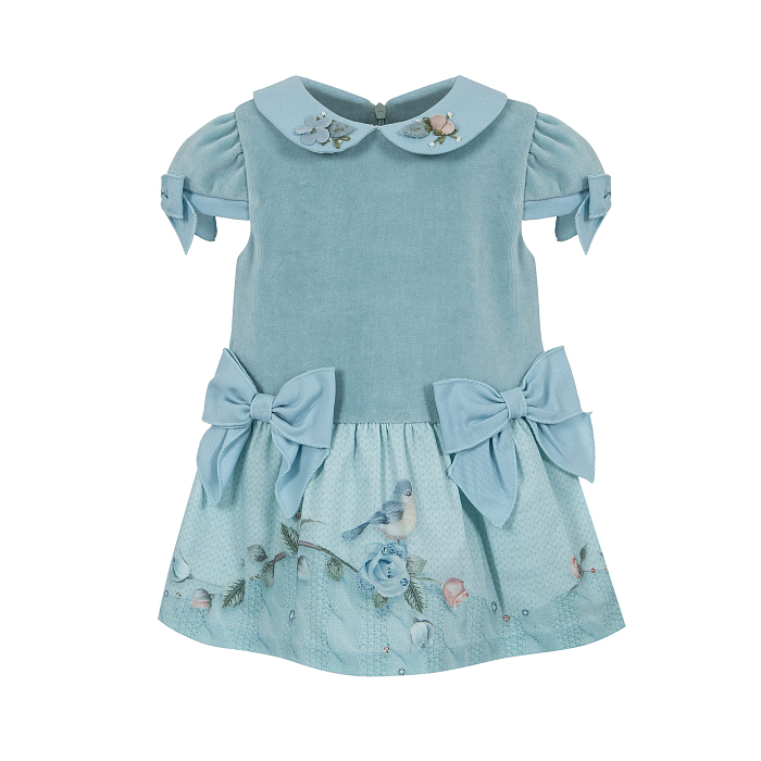 - 🎨 Дизайн: цветочный принт с розами и птичками, бантики на рукавах
