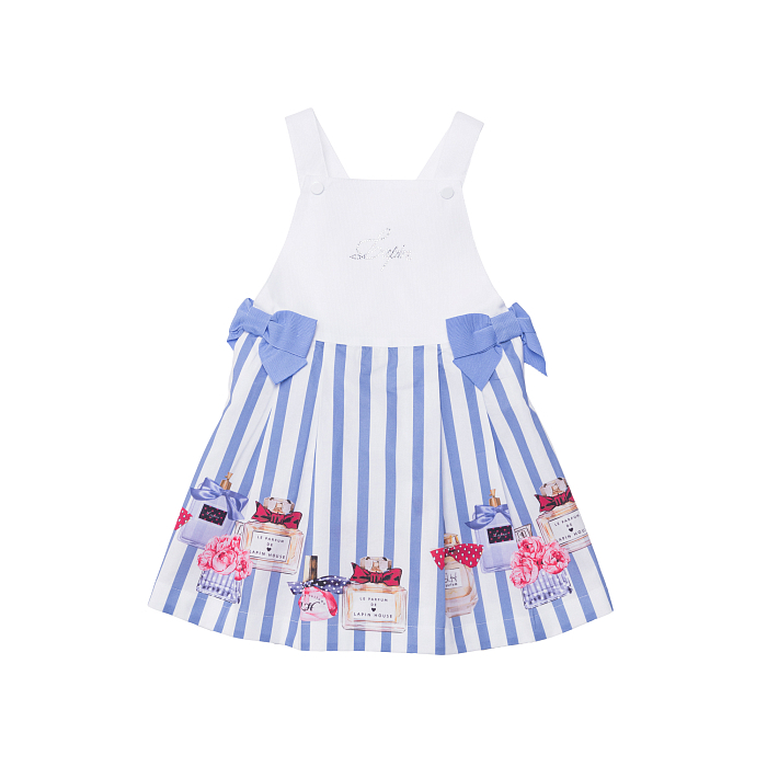 Сарафан Lapin House – это идеальный выбор для девочек! Изготовленный из 83% хлопка, 15% полиэстера и 2% эластана, он украшен очаровательными парфюмерными бутылочками и бантиками. Белый верх с синими полосами и яркими аксессуарами создает стильный и в то же время уютный образ. На фотографиях видны аккуратные голубые бантики на бретелях и нежные розы на бутылках. Качество от бренда из Греции и внимание к деталям делают этот сарафан отличным выбором для вашего ребенка!