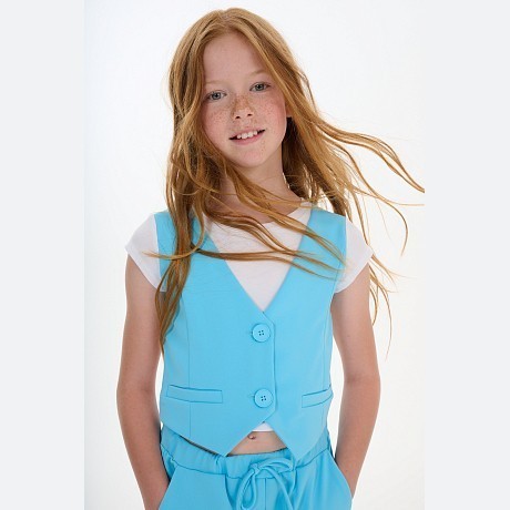 - 🎨 Дизайн: бирюзовый цвет, жилет с двумя пуговицами