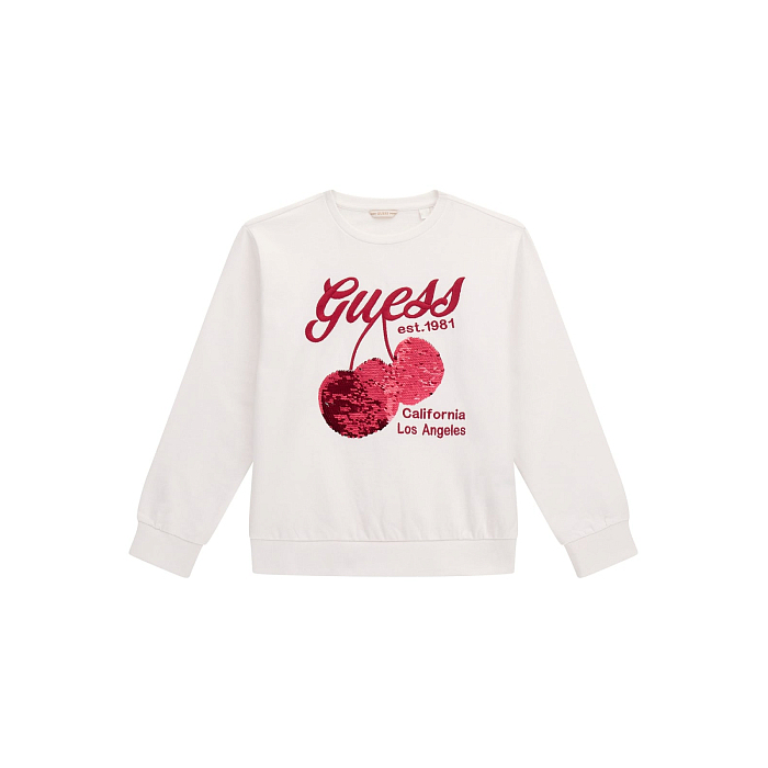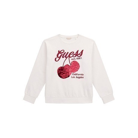 Джемпер Guess – это идеальный выбор для девочек! Изготовленный из 100% хлопка, он украшен очаровательными вишнями и надписью Guess. Белая основа с яркими красными вишнями создает яркий и стильный образ. На фотографиях видна аккуратная красная контрастная окантовка по краю и мягкая текстура ткани. Качество от бренда из США и внимание к деталям делают этот джемпер отличным выбором для вашего ребенка!
