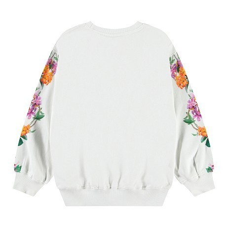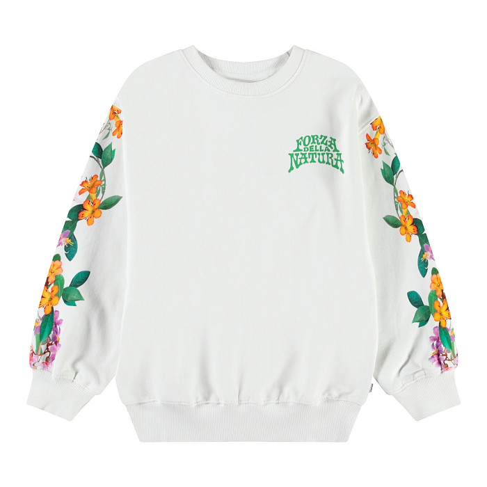 Джемпер для девочек Molo – это идеальный выбор для вашего ребенка! Изготовлен из 100% натурального хлопка, он украшен цветочным принтом на рукавах и надписью FORZA DELLA NATURA. Белая основа с яркими цветами создает легкое и веселое настроение. На фотографиях видна аккуратная текстура ткани и мягкая окантовка по краю. Качество от бренда из Дании и внимание к деталям делают этот джемпер отличным выбором для вашего девочки!
