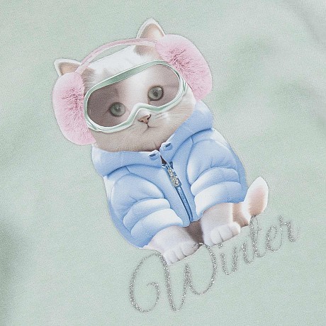 - 🎨 Дизайн: кот в зимней одежде, серо-зеленый цвет