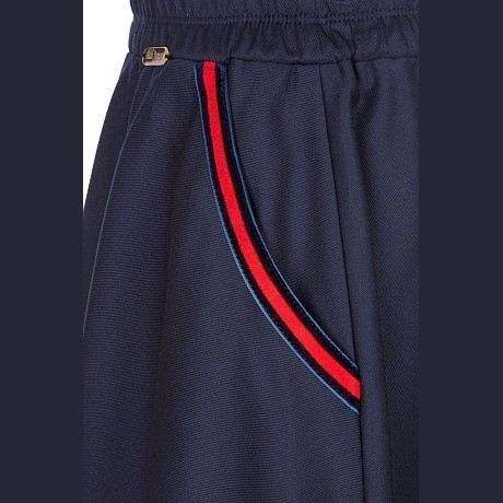 - 🎨 Дизайн: темно-синий фон с красными и синими полосами, эластичная резинка по талии, аккуратные складки