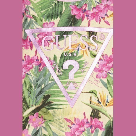 - 🎨 Дизайн: тропические розовые цветы, зеленые листья, логотип Guess