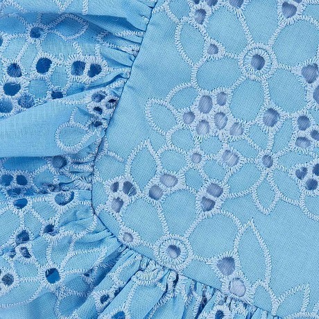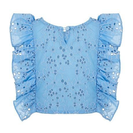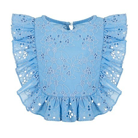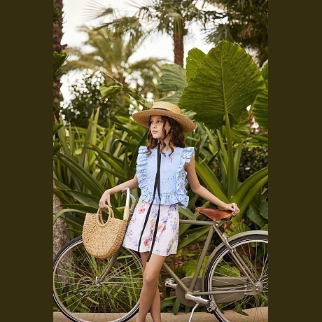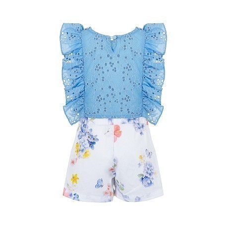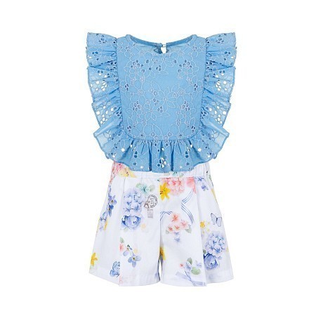 - 🎨 Дизайн: голубая блузка с вышивкой, шорты с цветочным принтом