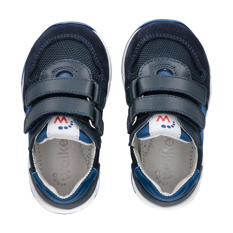 Кроссовки для мальчиков Walkey – это идеальный выбор для активных детей! Изготовленные из высококачественной кожи и термопластичной резины, они сочетают в себе комфорт и стиль. Темно-синий цвет с белыми и синими полосками делает обувь яркой и модной. Удобные липучки обеспечивают идеальную посадку и комфорт во время игры. На фотографиях видны аккуратные липучки на передней части и мягкая подкладка из кожи. Качество от итальянского бренда Walkey делает эту обувь отличным выбором для вашего ребенка!