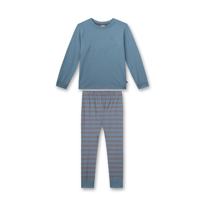 Пижама Sanetta – это идеальный выбор для маленького принца! Изготовленная из 50% хлопка и 50% модала, она украшена очаровательным принтом медведя на серо-голубом фоне. Мягкая ткань с эластичной резинкой на талии обеспечивает идеальную посадку и комфорт. На фотографиях видна аккуратная контрастная окантовка по краю и мягкость ткани. Качество от бренда из Германии и внимание к деталям делают эту пижаму отличным выбором для вашего ребенка!