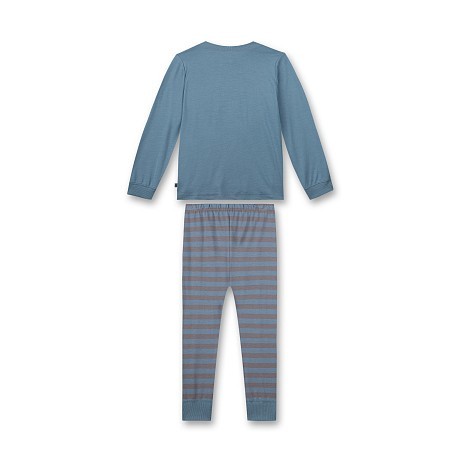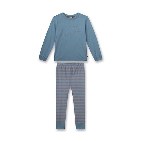 Пижама Sanetta – это идеальный выбор для маленького принца! Изготовленная из 50% хлопка и 50% модала, она украшена очаровательным принтом медведя на серо-голубом фоне. Мягкая ткань с эластичной резинкой на талии обеспечивает идеальную посадку и комфорт. На фотографиях видна аккуратная контрастная окантовка по краю и мягкость ткани. Качество от бренда из Германии и внимание к деталям делают эту пижаму отличным выбором для вашего ребенка!