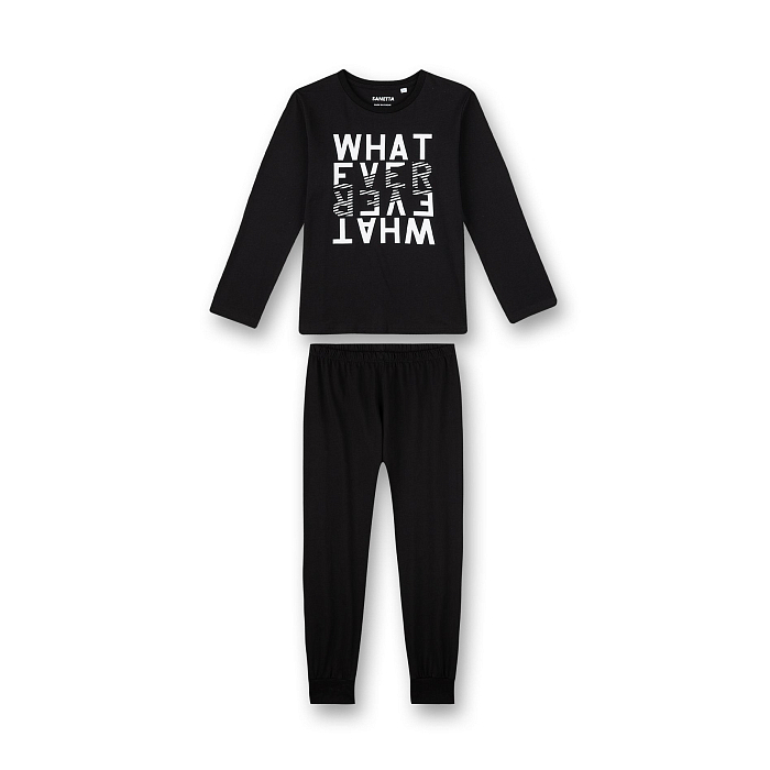 Пижама Sanetta – это идеальный выбор для подростков! Изготовленная из 100% хлопка, она украшена стильной надписью 'WHAT EVER' на черном фоне. Удобная посадка и эластичная резинка на талии делают эту пижаму комфортной и стильной. На фотографиях видна аккуратная надпись с разными словами, а также эластичная резинка на талии и удобные манжеты на рукавах и ножках. Качество от немецкого бренда Sanetta и внимание к деталям делают эту пижаму отличным выбором для вашего подростка!