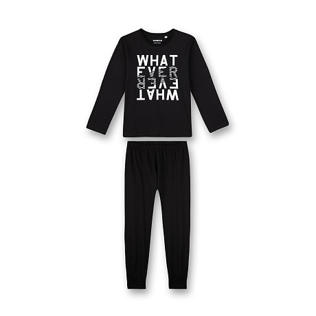 Пижама Sanetta – это идеальный выбор для подростков! Изготовленная из 100% хлопка, она украшена стильной надписью 'WHAT EVER' на черном фоне. Удобная посадка и эластичная резинка на талии делают эту пижаму комфортной и стильной. На фотографиях видна аккуратная надпись с разными словами, а также эластичная резинка на талии и удобные манжеты на рукавах и ножках. Качество от немецкого бренда Sanetta и внимание к деталям делают эту пижаму отличным выбором для вашего подростка!