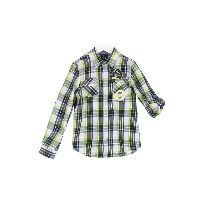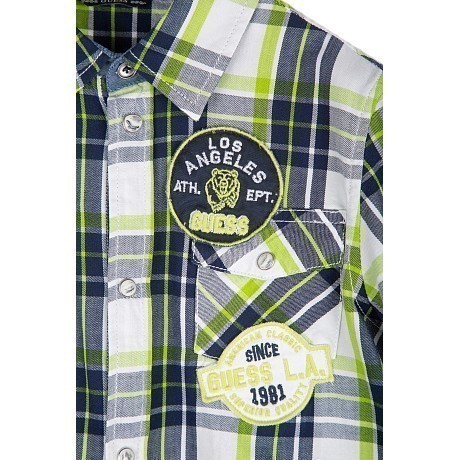 Сорочка верхняя (рубашка) Guess – идеальный выбор для вашего юного модника! Изготовлена из 100% хлопка, она выполнена в стильном клетчатом принте с зелеными, синими и белыми полосами. Рубашка с длинными рукавами и отложным воротником подчеркивает элегантный и современный стиль. На передней части рубашки находятся небольшие карманы и вышитые логотипы Guess, а также надпись "Los Angeles". Качественная посадка и удобная застежка на пуговицы делают эту рубашку комфортной и стильной. На фотографиях видны аккуратные логотипы Guess и надпись "Los Angeles", а также карманы на передней части.