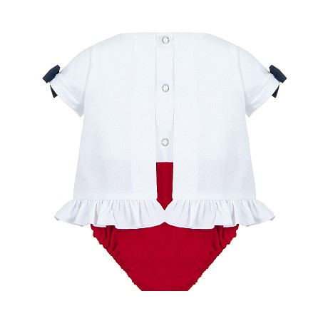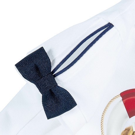Песочник Lapin House – это идеальный выбор для девочек! Изготовленный из 96% хлопка и 4% эластана, он украшен очаровательным принтом морского щенка в круглой рамке, надписью Sailor Girl и красными кружевами на нижней части. Белый верх с ярким принтом и красными кружевами создает нежное и морское настроение. На фотографиях видны аккуратные кружевные детали по краю и мягкая текстура ткани. Удобная посадка и внимание к деталям делают этот песочник отличным выбором для вашего малыша!