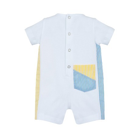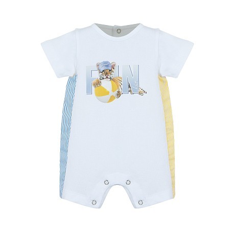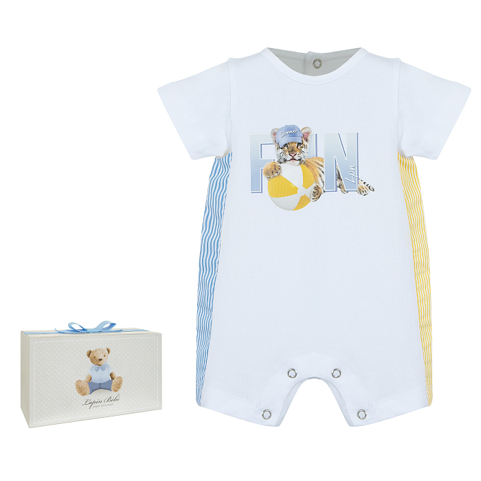 Песочник Lapin House – это идеальный выбор для мальчиков! Изготовленный из 89% хлопка, 6% лайкра и 5% полиамида, он украшен очаровательным принтом тигра с надписью "Fun". Нежная белая основа с ярким принтом создает игривое и в то же время уютное настроение. На фотографиях видна аккуратная голубая и желтая окантовка по краю и мягкая текстура ткани. Качество от бренда из Греции и внимание к деталям делают эту модель отличным выбором для вашего малыша!