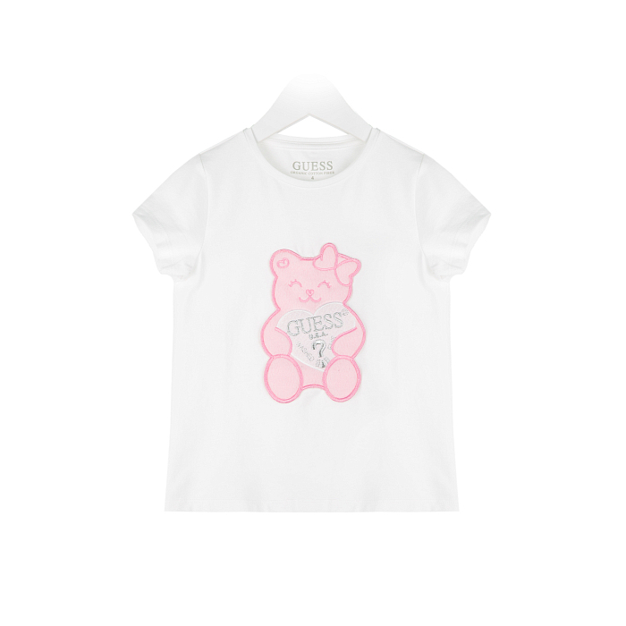 Футболка для девочки Guess – это идеальный выбор для маленьких модниц! Изготовленная из 95% хлопка и 5% эластана, она украшена очаровательным принтом медведя с бантом. Белая основа с розовыми акцентами создает нежное и в то же время стильное настроение. На фотографиях видна аккуратная розовая контрастная окантовка по краю и мягкая текстура ткани. Качество от бренда из США и внимание к деталям делают эту футболку отличным выбором для вашего ребенка!
