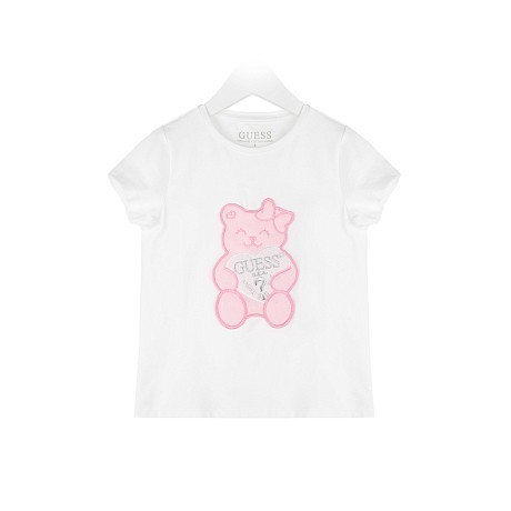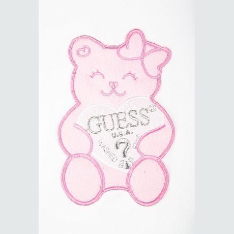 Футболка для девочки Guess – это идеальный выбор для маленьких модниц! Изготовленная из 95% хлопка и 5% эластана, она украшена очаровательным принтом медведя с бантом. Белая основа с розовыми акцентами создает нежное и в то же время стильное настроение. На фотографиях видна аккуратная розовая контрастная окантовка по краю и мягкая текстура ткани. Качество от бренда из США и внимание к деталям делают эту футболку отличным выбором для вашего ребенка!