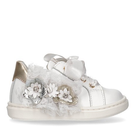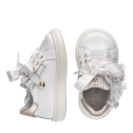 Кроссовки Walkey – это идеальный выбор для маленьких модниц! Изготовленные из высококачественной кожи и резины термопластичной, они украшены изысканными цветочными аппликациями и белым бантом. Белый цвет подчеркивает нежность и стилизованность модели. На фотографиях видны аккуратные белые ленты для шнуровки, золотые металлические детали и мягкая подкладка. Качество от итальянского бренда и внимание к деталям делают эти кроссовки отличным выбором для вашего ребенка!