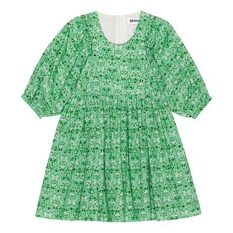 Платье для девочек Molo – это идеальный выбор для летних прогулок! Изготовленное из 100% натурального хлопка, оно украшено изящным зеленым принтом с мелкими цветочками и листьями. Элегантный V-образный вырез и рукава-фонарики создают нежный и романтичный образ. На фотографиях видна аккуратная зеленая окантовка по краю и мягкая текстура ткани. Качество от бренда из Дании и внимание к деталям делают эту модель отличным выбором для вашего ребенка!