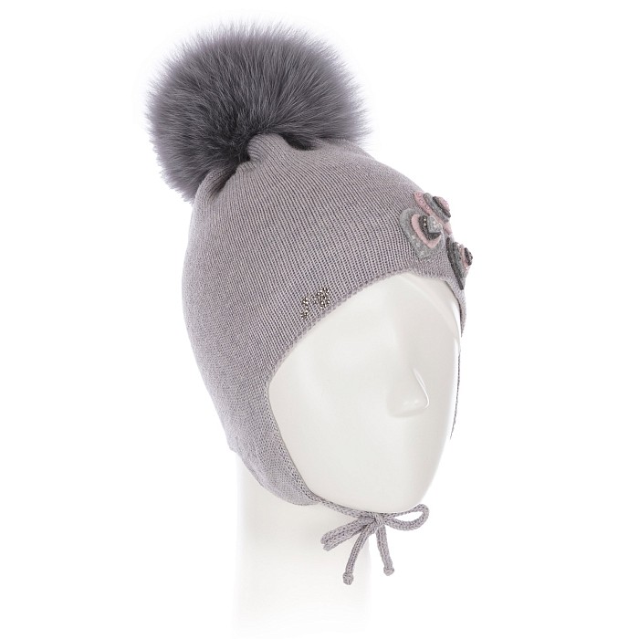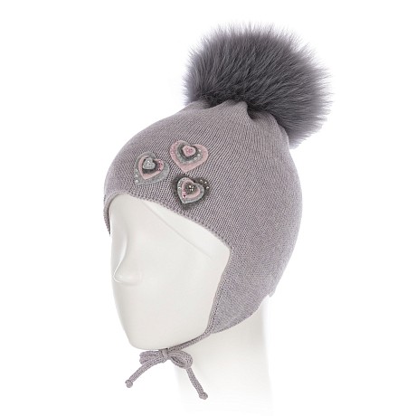 Шапка для девочек Joli Bebe серая с меховым помпоном и сердечками