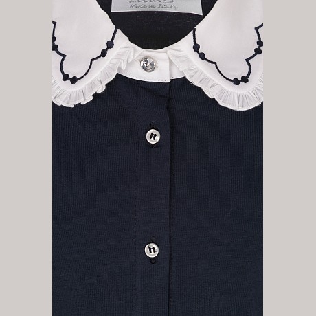 Блузка Ella B. – это идеальный выбор для девочек 7-10 лет! Изготовленная из 96% хлопка и 4% эластана, она сочетает в себе мягкость и эластичность. Темно-синий цвет с белым кружевом на воротнике создает стильный и нежный образ. На фотографиях видна аккуратная отделка кружевом по краю воротника и кнопки на передней части блузки. Качество от бренда и внимание к деталям делают эту блузку отличным выбором для вашего ребенка!