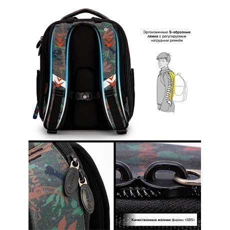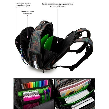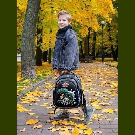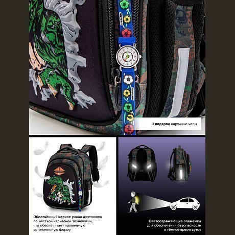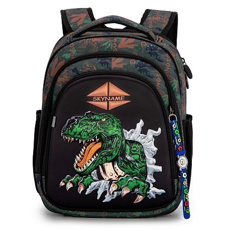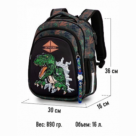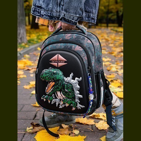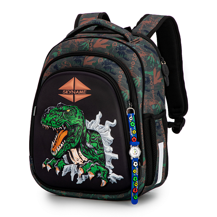 Ранец+часы SkyName – это идеальный выбор для юных школьников! Изготовленный из 100% полиэстера, он украшен ярким принтом динозавра и надписью SkyName. Нежная черная основа с яркими зелеными и коричневыми акцентами создает игривое и в то же время стильное настроение. На фотографиях видна аккуратная зеленая контрастная окантовка по краю и удобная ручка для переноски. Качество от бренда и внимание к деталям делают этот ранец отличным выбором для вашего ребенка!