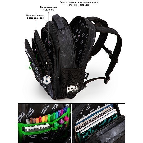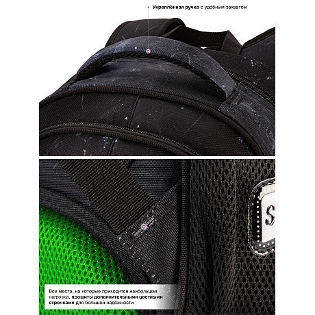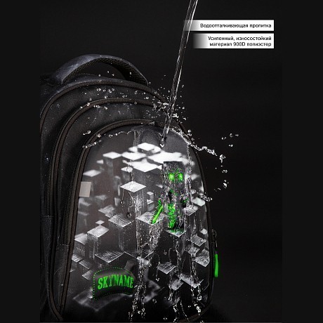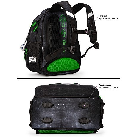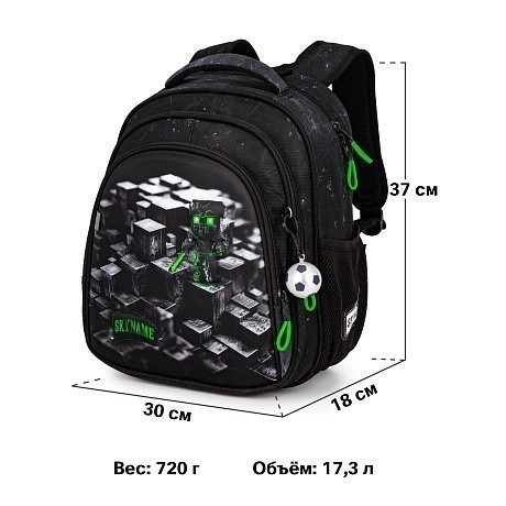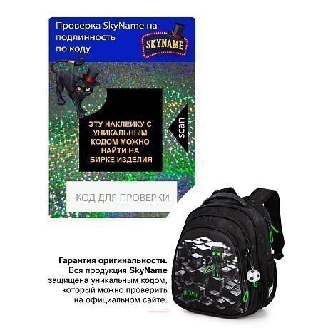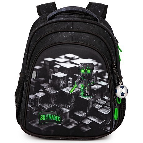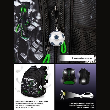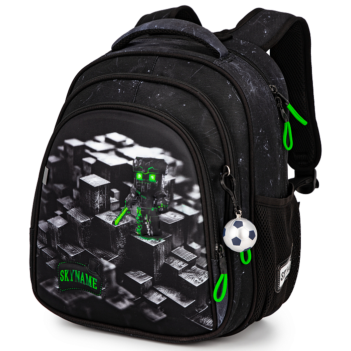 Рюкзак+брелок мячик SkyName – это идеальный выбор для юных модников! Изготовлен из прочного материала 100% этиленвинилацетат/полиэстер, он украшен ярким принтом космического робота с блестящими деталями. Черный фон и зеленые акценты создают современный и стильный образ. На фотографиях видна аккуратная зеленая окантовка по краю и мягкая текстура ткани. Качество от бренда SKYNAME и внимание к деталям делают этот рюкзак отличным выбором для вашего ребенка!