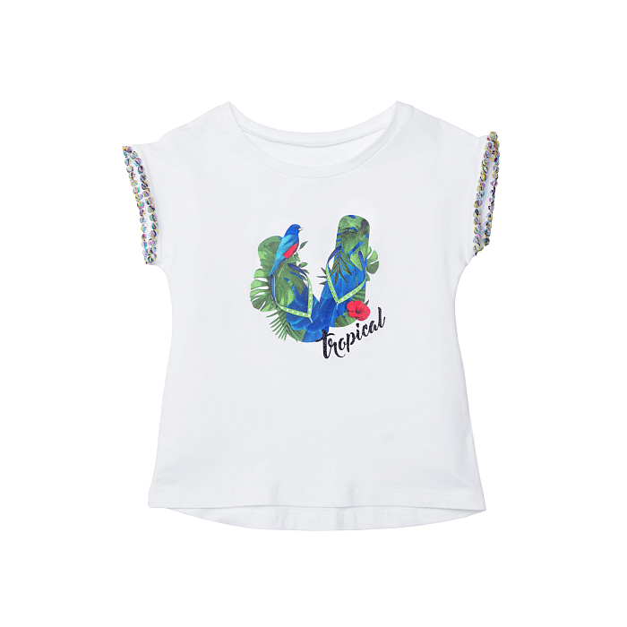 Белая футболка с тропическим принтом и бахромой на рукавах