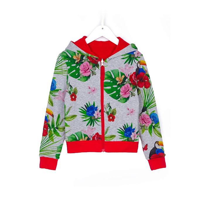 Жакет тр. для девочки Lapin House – это идеальный выбор для стильных и модных девочек! Изготовлен из комбинации хлопка и эластана, он украшен ярким тропическим принтом с цветами и листьями. Красная манжета и капюшон подчеркивают стильный дизайн. На фотографиях видны яркие цветы, листья и тропические птицы на сером фоне. Качество от бренда из Греции и внимание к деталям делают этот жакет отличным выбором для вашего ребенка!